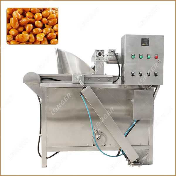 Heat the oil through the heating system. When the oil temperature reaches the set temperature, pour in the soybeans and start stirring and frying. During the frying process, it is automatically stirred and rolled, so that the soybeans are heated evenly and the color is golden. After the soybeans are fried, the leaking basket can be automatically turned over, drained, and poured out.